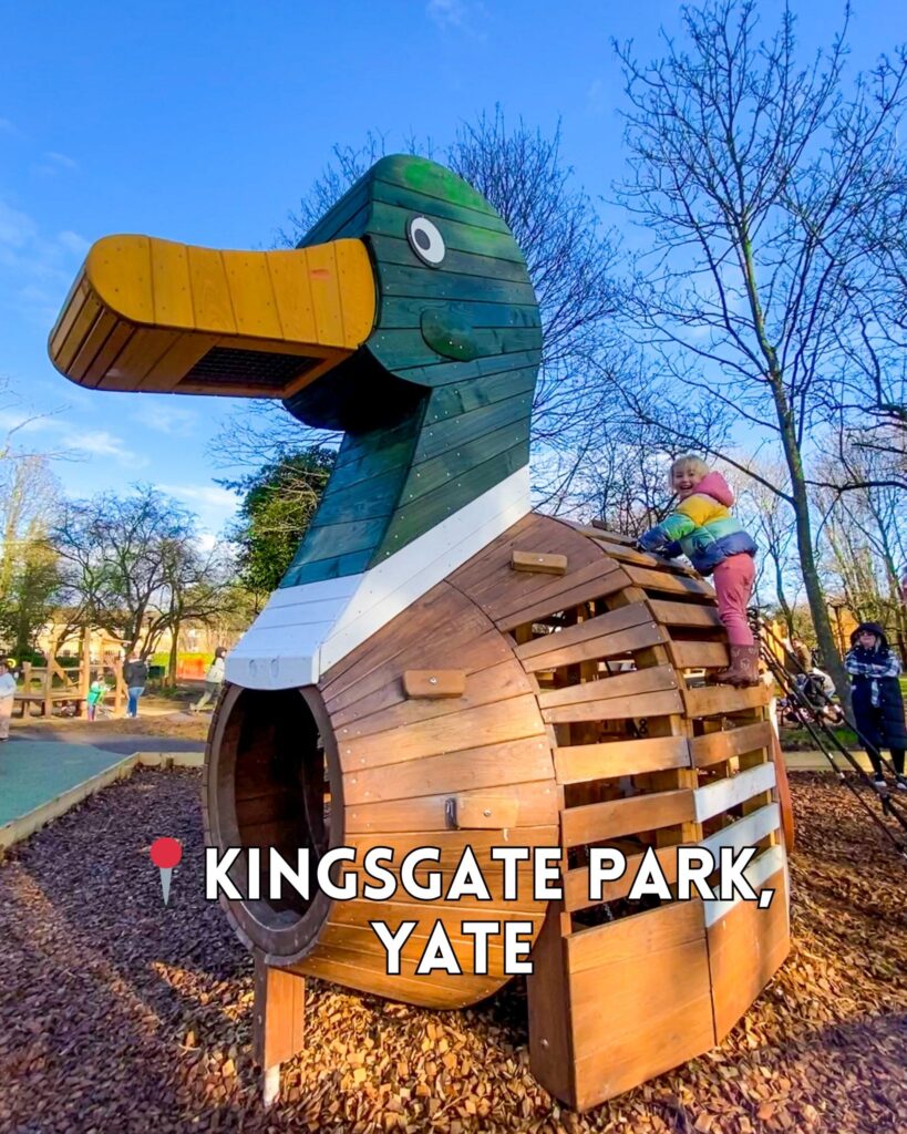 Kingsgate Park in Yate has fantastic wooden adventure play areas in the treetops and some lovely play equipment for younger ones. It was refurbished in 2024! There are swans and ducks to feed on a small lake, picnic opportunities, a stream for paddling and public toilets.